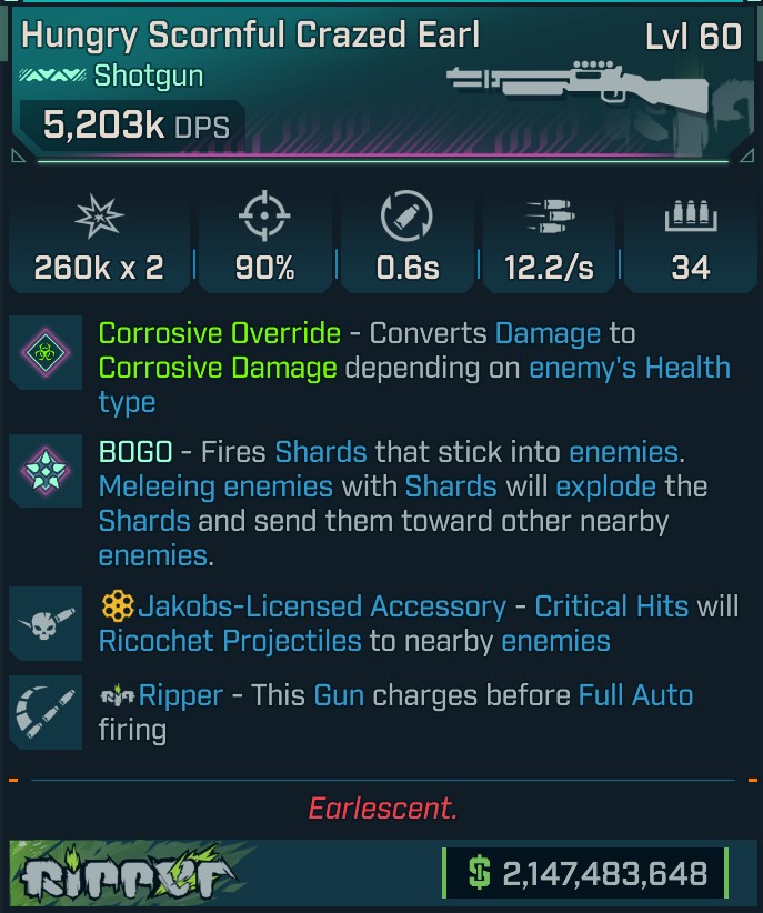 ⭐[PEARL] L60 CRAZED EARL (CORROSIVE) - 5,203K DPS - 90% ACC - 12.2/s F.R. - 0.6s RELOAD - RICOCHET⭐