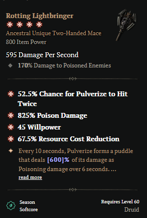 SEASON 10 100% PERFECT ROTTING LIGHTBRINGER 4 GA 600% ASPECT POWER TWO HAND MACE FOR PULVERIZE DRUID
