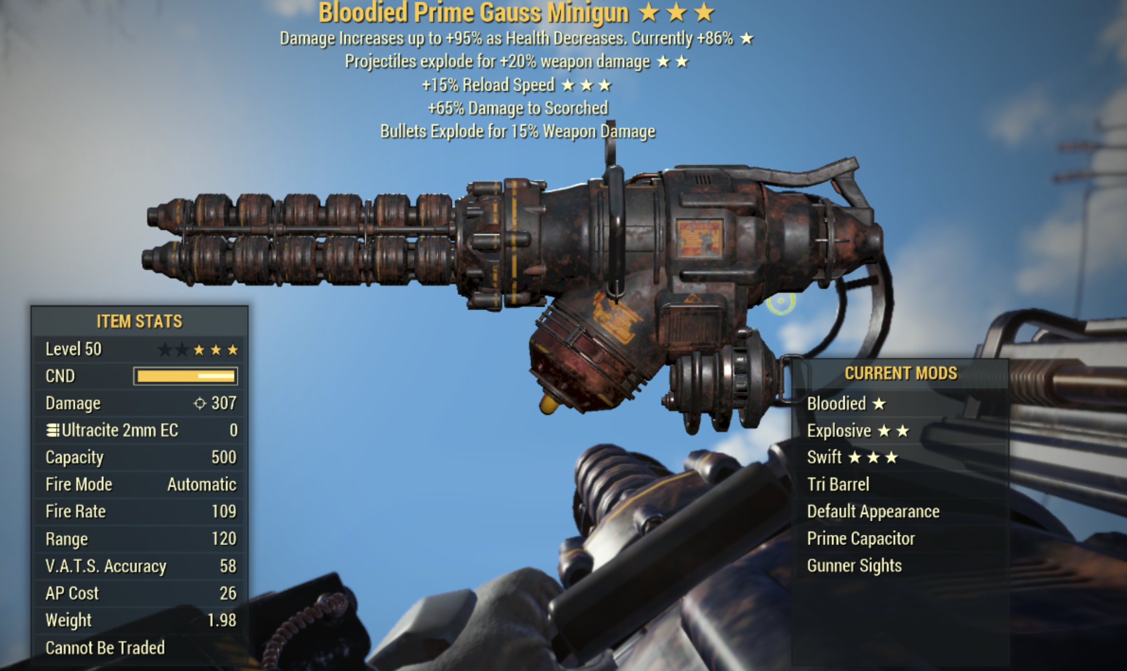 Bloodied 25% Faster Fire Rate Gauss Minigun 90% Reduced Weight / 35% Less VATS + Explosive