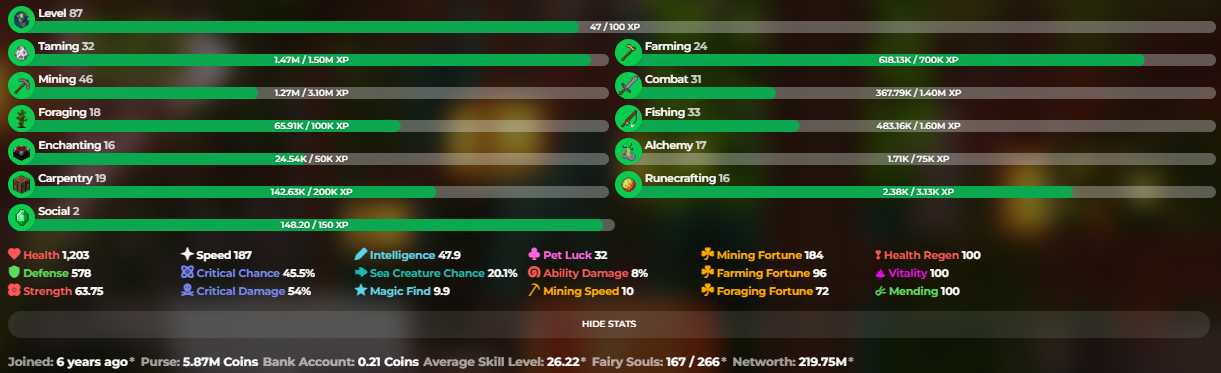 ✅❗️Solo-Coop | VIP | 87 SB lvl | 26.22 AVG | Cata 22 | 218.85M NW | Full accept | Hypixel SkyBlock❗️✅
