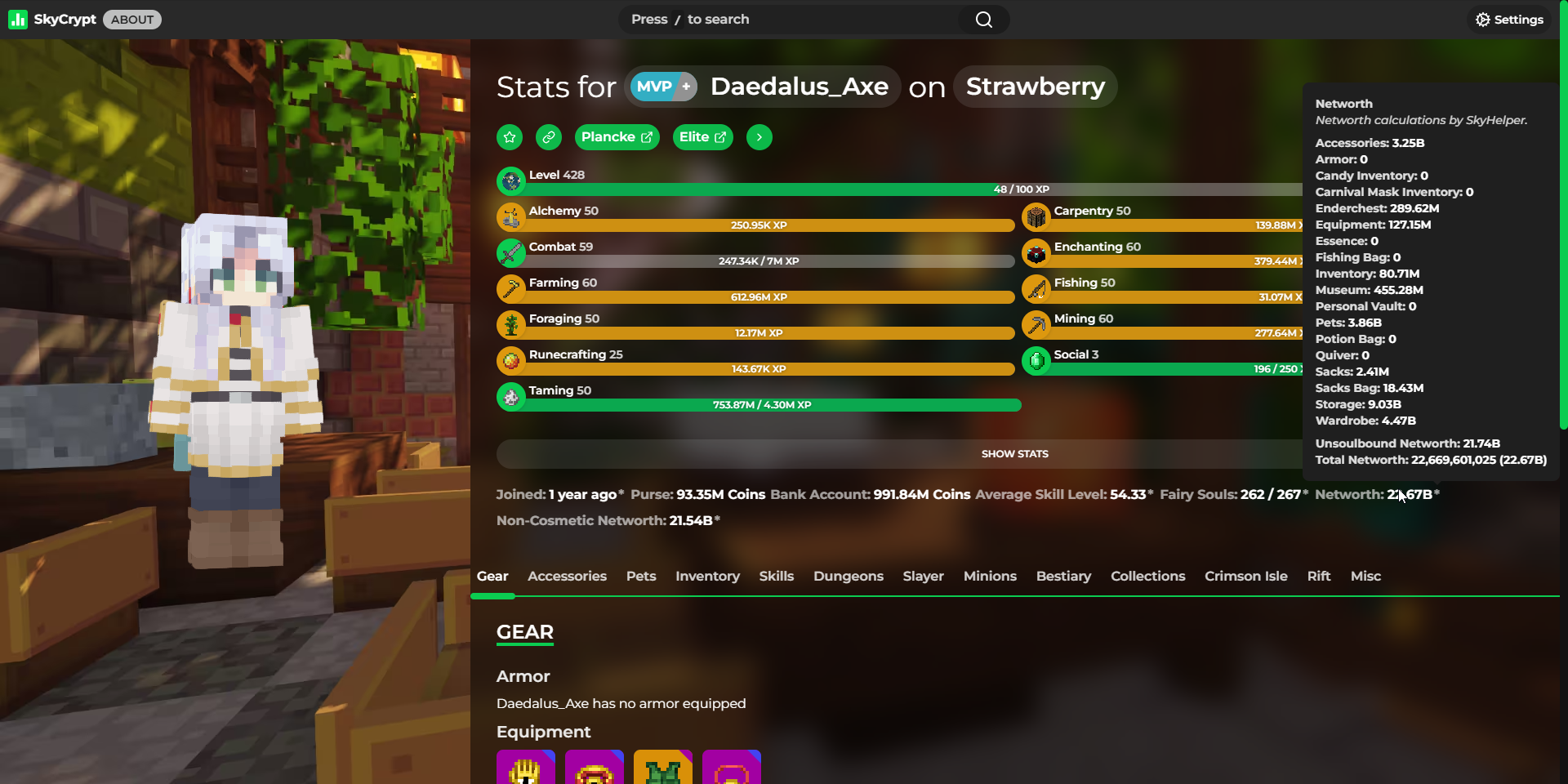 Detailed statistics - https://sky.shiiyu.moe/stats/Daedalus_Axe/Strawberry#Gear ⚡