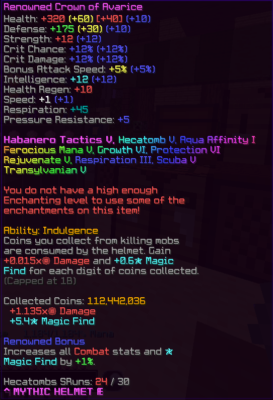 • Mythic Renowned Crown of Avarice w/ Habanero Tactis V, Art of Peace, Hecatomb, g6p6, Many Enchants