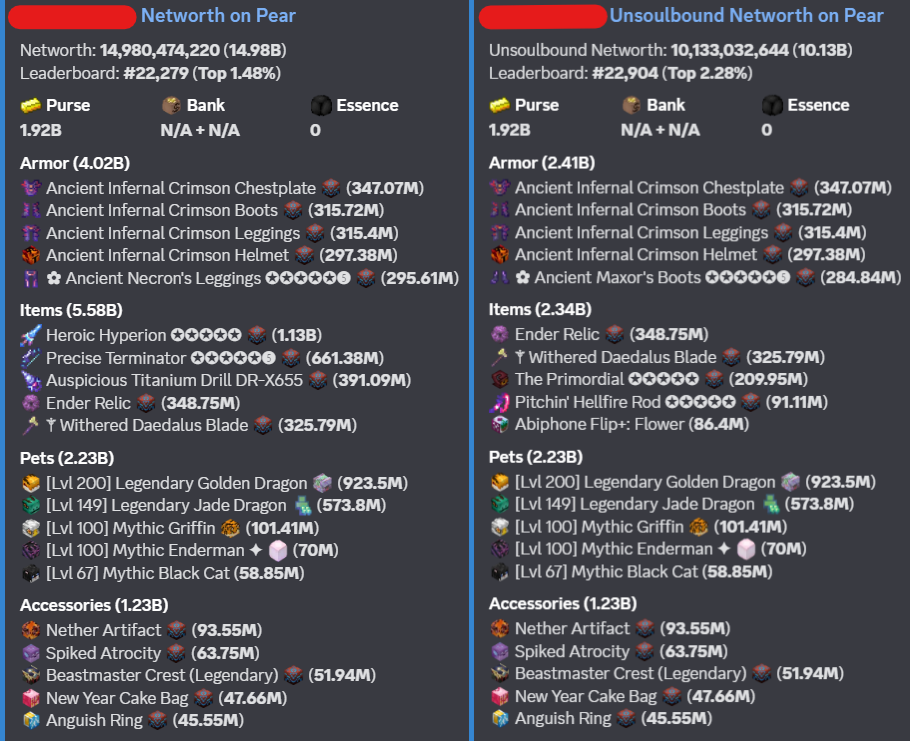 • Mythic Ancient 3/4 Necron Set w/ 5 Master Stars, 5 Wither Stars, Legion V, many enchants + Ancient Diamond Necron Head w/ 5 Master Stars, 5 Wither Stars, Legion V, Hecatomb X, g6p6, many enchants