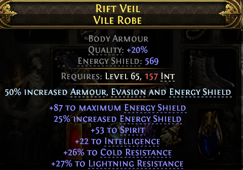 569 ENERGY SHIELD CHEST 53 SPIRIT 22 INT 27% LIGHT 26% COLD RESISTS WITCH SORCERESS LICH INFERNALIST