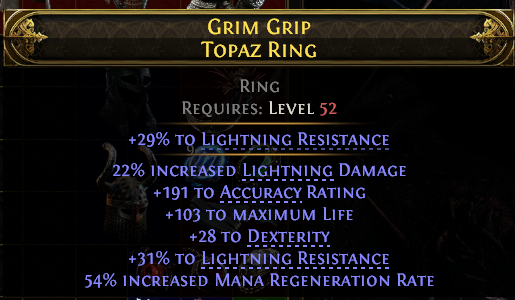 TOPAZ RING - 22% INC. LIGHTNING DAMAGE/ 28 DEX 103 MAX LIFE 191 ACCURACY RATING 54% MANA REGEN RESIS
