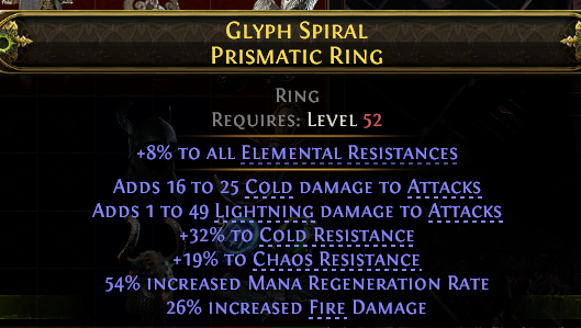 PRISMATIC RING - ADD 25 COLD / 49 LIGHTNING DAMAGE - 26% INC. FIRE DAMAGE - 54% MANA REGEN - RESISTA